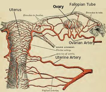 Below, schematic image of the uterine and ovarian artery, supplying the female genital organs.