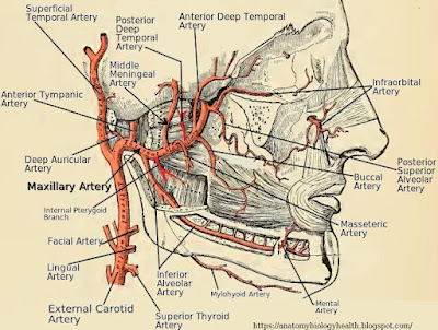 The maxillary artery is one of the three blood vessels which supply the human face. The others are the transverse facial and the facial artery. It has a tortuous course and gives off important deep branches that bring oxygenated blood to the upper portion of face, middle ear, muscles of mastication, teeth and gum of mandible and maxilla, hard palate, nasal cavity, and other deep structures of face.